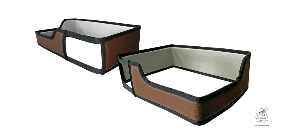 Paar braune Kunstleder Sitzsockel mit schwarzer Umrandung und hellem Innenfutter.