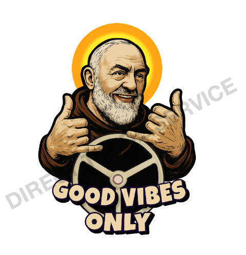 DTS Aufkleber mit lächelndem Cartoon-Mann, Bart, Lenkrad und "GOOD VIBES ONLY" Schriftzug.