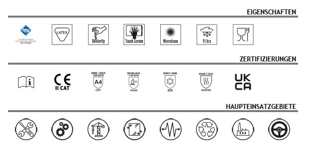 Eigenschaften: sehr angenehmes und flexibles Garn. Stärken: Komfort, Flexibilität, Griffigkeit, Schnittfestigkeit Leistungsstufe D (TDM-Schnittfestigkeitsprüfung)/A4 (ANSI/ISEA), Schutz vor Kontaktkälte.