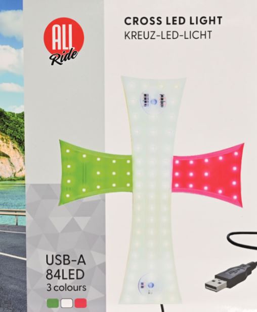 Kreuzförmige LED-Innenleuchte in Weiß, Grün und Rot. Der USB-A Anschluss ist sichtbar.