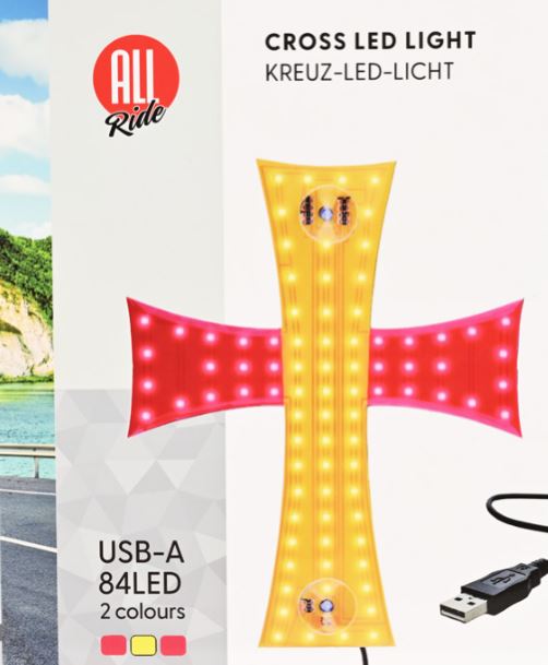 Kreuzförmige LED-Innenleuchte in Länderflaggen-Farben Blau, Weiß und Rot mit USB-A Anschluss.