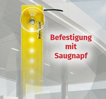Gelbe AR LED Lichtleiste mit leuchtenden LEDs und Saugnapf. Text: Befestigung mit Saugnapf.
