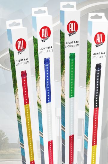 Mehrere AR LED Lichtleisten in weißer Verpackung. Farben: Rot-Gelb, Blau-Weiß, Grün-Weiß, Schwarz-Rot.