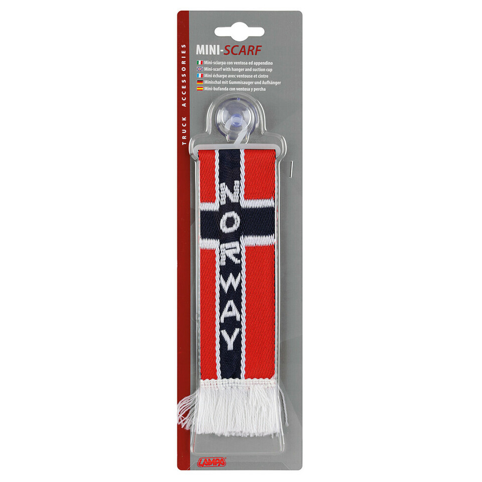 Roter, blauer und weißer Minischal mit norwegischem Flaggenmuster, 'NORWAY' Schriftzug, Saugnapf und Fransen.