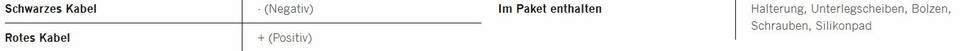 Anschlussdetails: Schwarzes Kabel (Negativ), Rotes Kabel (Positiv). Enthaltenes Zubehör: Halterung, Schrauben, Silikonpad.
