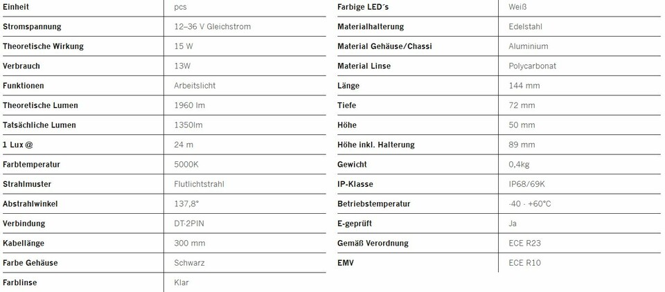 Die Installation eines neuen Produkts sollte einfach sein. Die E-Line R verfügt über einen DT-2-Anschluss für eine einfache Installation. Die Leuchte ist 14,4 cm lang und 5 cm hoch (ohne Halterung), sodass die passende Passform leicht zu finden ist. Natürlich ist alles, was Sie brauchen, im Lieferumfang enthalten: Halterung, Unterlegscheiben, Bolzen, Schrauben und Silikonpad. Sie verbraucht nur 13 W und arbeitet mit 12–36 V.