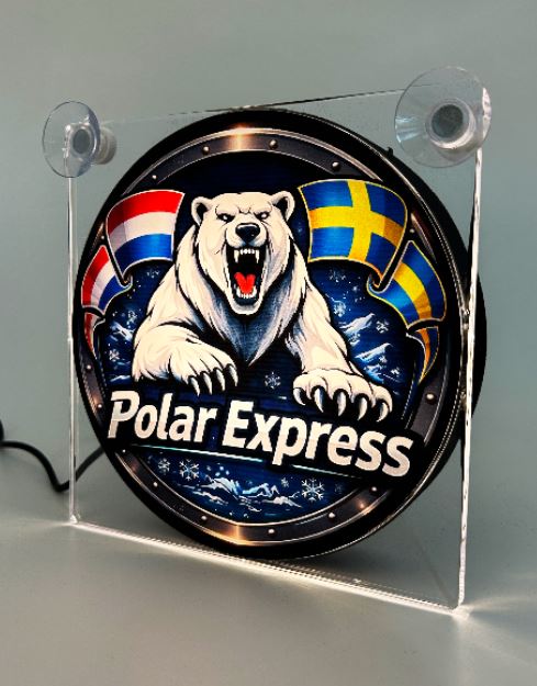 Beleuchteter Leuchtkasten mit Motiv Angry Eisbär in dunkelblau, weiß, rot und gelb. USB-Anschluss abgebildet.. Eckiges Schild mit Saugern.
