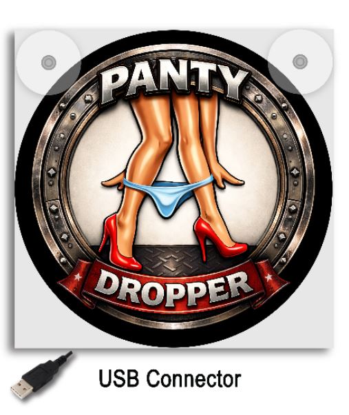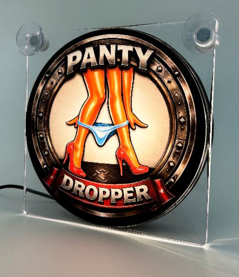 Beleuchteter Leuchtkasten mit Motiv Panty Dropper in schwarz, weiß, rot und blau. USB-Anschluss abgebildet.. Eckiges Schild mit Saugern.