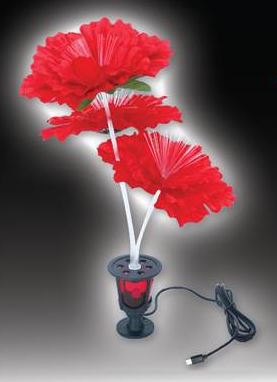 Beleuchtete rote Kunstblumen auf weißen Stielen in schwarzem Standfuß mit USB-Kabel.